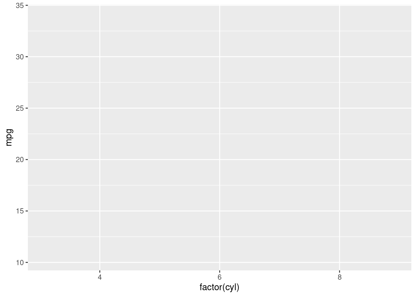 ggplot(data = mtcars, aes(x = factor(cyl), y = mpg))