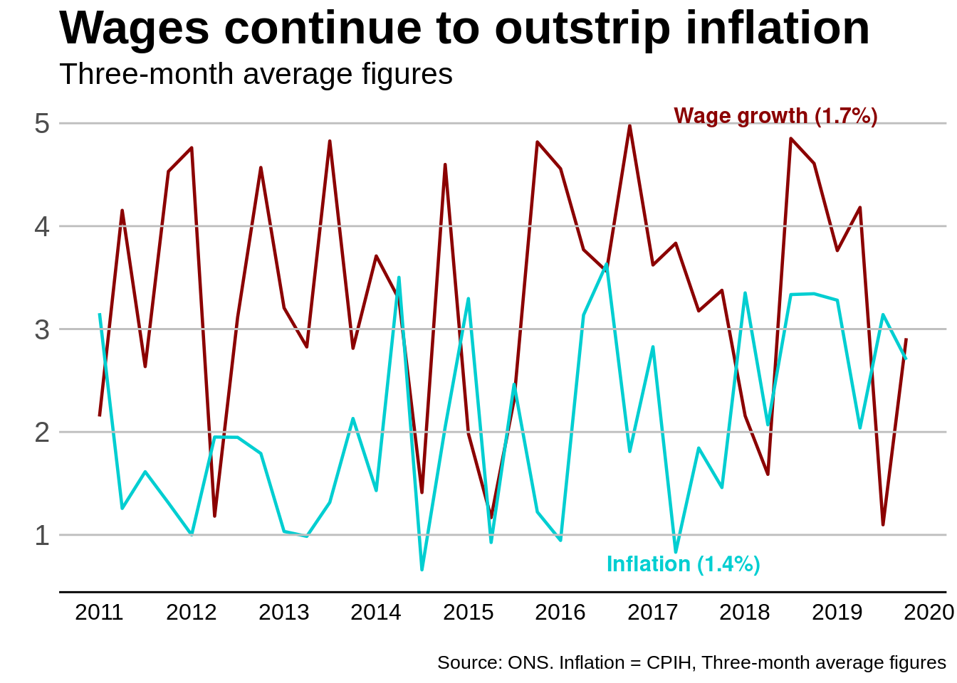 # Assuming your data frame is named 'data' and it has columns 'date', 'wage_growth', and 'inflation'ggplot(data, aes(x=date)) +geom_line(size =0.8,aes(y=wage_growth, colour="Wage growth")) +geom_line(size =0.8,aes(y=inflation, colour="Inflation")) +#coord_cartesian(xlim = c(2011, 2020), ylim = c(1,5)) + scale_x_date(breaks =seq(as.Date("2011-01-01"), as.Date("2020-01-01"), by="1 year"),date_labels ="%Y")+# Correct approach for Date objects#scale_x_continuous(breaks = seq(2011, 2020, by = 1)) + # Add the scale layergeom_hline(yintercept =c(1, 2, 3,4 ,5 ), color ="grey", linewidth =0.5, linetype ="solid") +# Add horizontal linesscale_colour_manual(values=c("Wage growth"="darkred", "Inflation"="#00CED1")) +labs(title="Wages continue to outstrip inflation",subtitle="Three-month average figures",caption="Source: ONS. Inflation = CPIH, Three-month average figures",x="",y="")+annotate("text", x =as.Date("2019-01-01"), y =5, label ="Wage growth (1.7%)", colour ="darkred", hjust =0.8, vjust =0,fontface ="bold", family ="sans", size =4) +annotate("text", x =as.Date("2019-01-01"), y =0.8, label ="Inflation (1.4%)", colour ="#00CED1", hjust =1.5, vjust =1,fontface ="bold", family ="sans", size =4) +theme_minimal() +theme(text =element_text(family ="Arial", colour ="black"),plot.title =element_text(size =25, face ="bold"),plot.subtitle =element_text(size =16),plot.caption =element_text(size =10),axis.text.x =element_text(angle =0, vjust =0.5, size =12,colour ="black"),axis.text.y =element_text(size =15),axis.line.y =element_blank(),legend.position ="none",panel.grid.major =element_blank(),panel.grid.minor =element_blank(),panel.background =element_blank(),axis.line =element_line(colour ="black"))