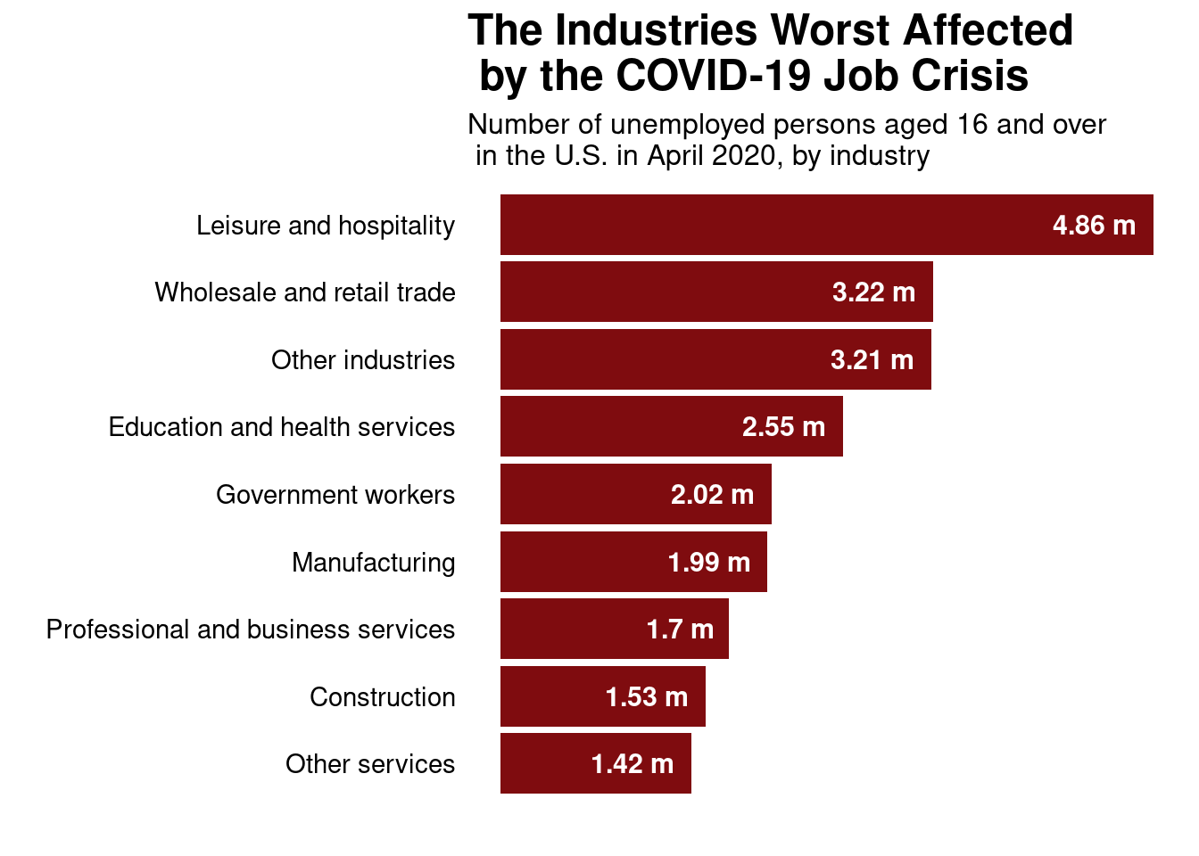 library(ggplot2)job_crisis_data$UnemployedNumbers <- job_crisis_data$UnemployedNumbers# Creating the plotggplot(data = job_crisis_data, aes(x =reorder(Industry, UnemployedNumbers), y = UnemployedNumbers)) +geom_bar(stat ="identity", fill ="#7f0c0f") +geom_text(aes(label =paste0(UnemployedNumbers, " m")), vjust =0.5, hjust =1.2,color ="white",fontface ='bold',size =4) +scale_y_continuous(labels = scales::comma, breaks = scales::pretty_breaks(n =10)) +theme_minimal() +labs(title ="The Industries Worst Affected\n by the COVID-19 Job Crisis",subtitle ="Number of unemployed persons aged 16 and over\n in the U.S. in April 2020, by industry",x ="",y ="") +theme(plot.title =element_text(size =18, face ="bold"),plot.subtitle =element_text(size =12),axis.text.x =element_blank(),axis.text.y =element_text(size =11,colour ="black"),panel.grid.major =element_blank(),panel.grid.minor =element_blank(),) +coord_flip() # Flip the coordinates to make a horizontal bar chart